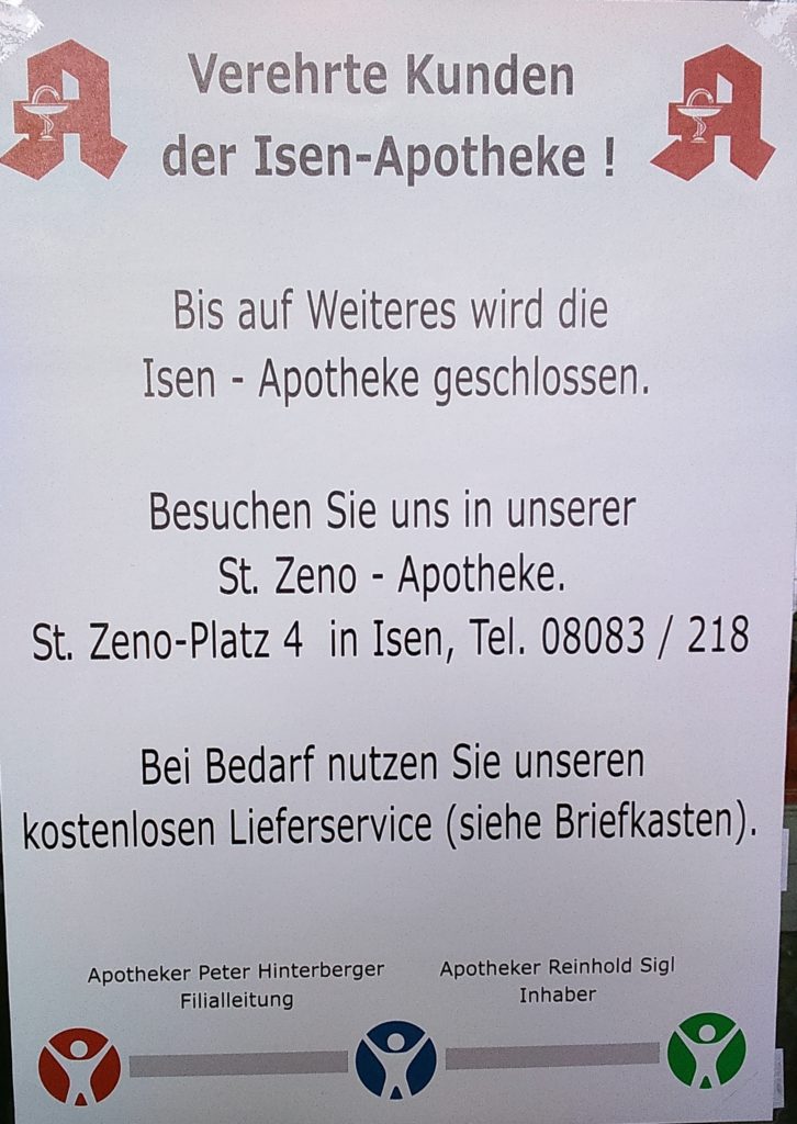 Isen, 1. Oktober 2016 – Die Isen-Apotheke Am Gries 21a ist ab sofort geschlossen und bleibt bis auf Weiteres auch zu. Wie uns der neue Inhaber Reinhold Sigl, der die Apotheke zum 1. Oktober 2016 von Brigitte Schmiedel übernommen hatte, bereits im September auf Nachfrage mitteilte, sei die weitere Zukunft der Apotheke derzeit noch nicht geklärt. Derzeit verweist ein Schild im Schaufenster der Isen-Apotheke auf die St-Zeno-Apotheke am St.-Zeno-Platz, die ebenfalls von Sigl betrieben wird . Patienten können derzeit Rezepte in einen Briefkasten einwerfen, der laut Aufschrift täglich um 16 Uhr geleert wird. Die Arzneimittel werden kostenlos innerhalb von 24 Stunden geliefert. Rückfragen bitte an die Zeno-Apotheke unter 08083 / 218. (hd)